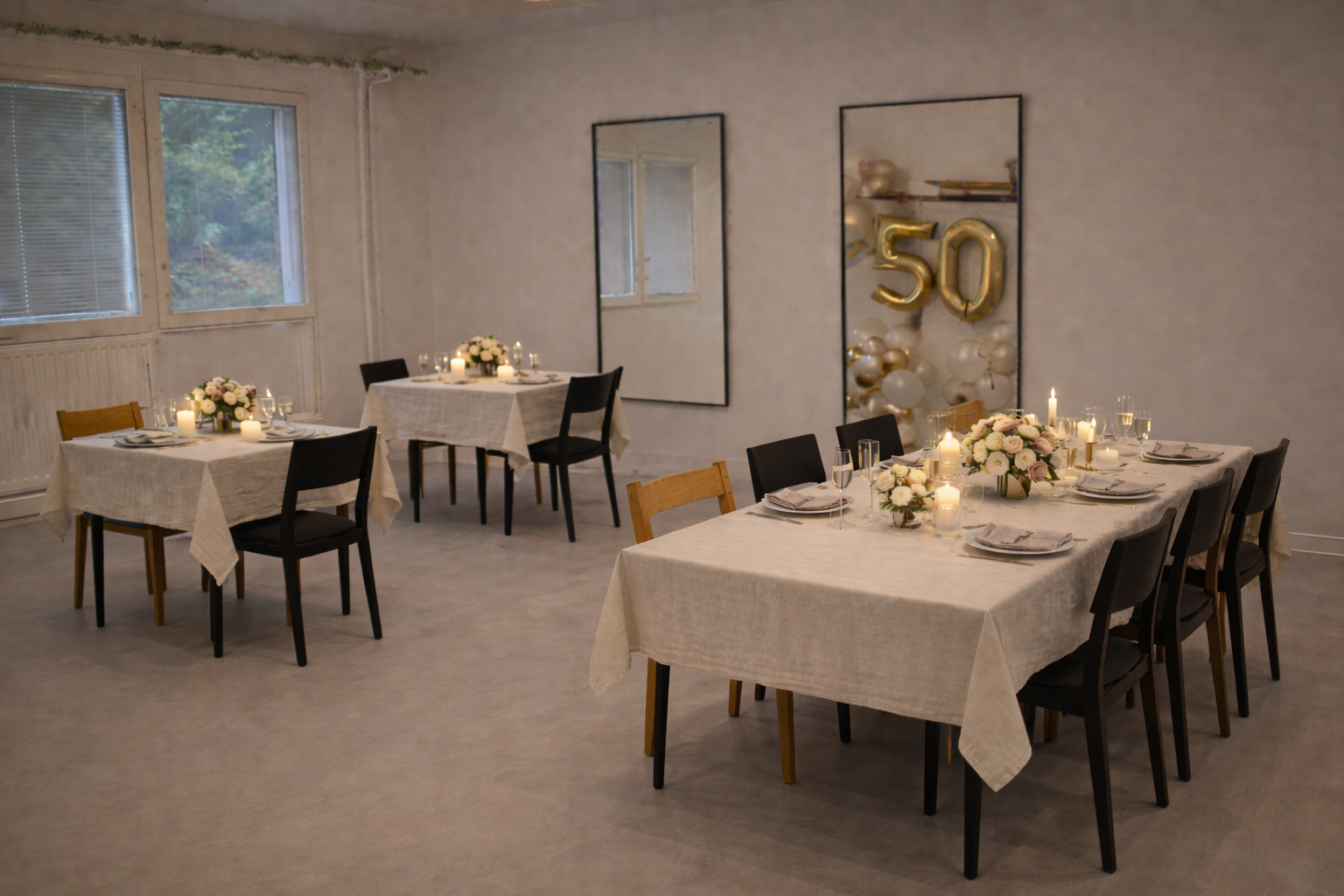 Toinen huone taipuu moneksi: se voi toimia valokuvaustilana eri taustoineen, lisätilana keittiön rinnalla järjestelyihin, esim. buffet-pöytänä tai aputilana, jos haluat jakaa osallistujat kahteen ryhmään.